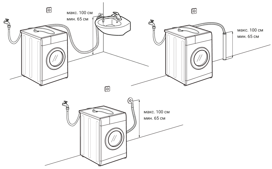 Чтобы обеспечить корректную работу сливного насоса и избежать самослива, выход сливного шланга стиральной машины должен находиться на высоте 60-100 см над уровнем пола. А расстояние между стиральной машиной и сливным клапаном не должно превышать 1,5 метров.